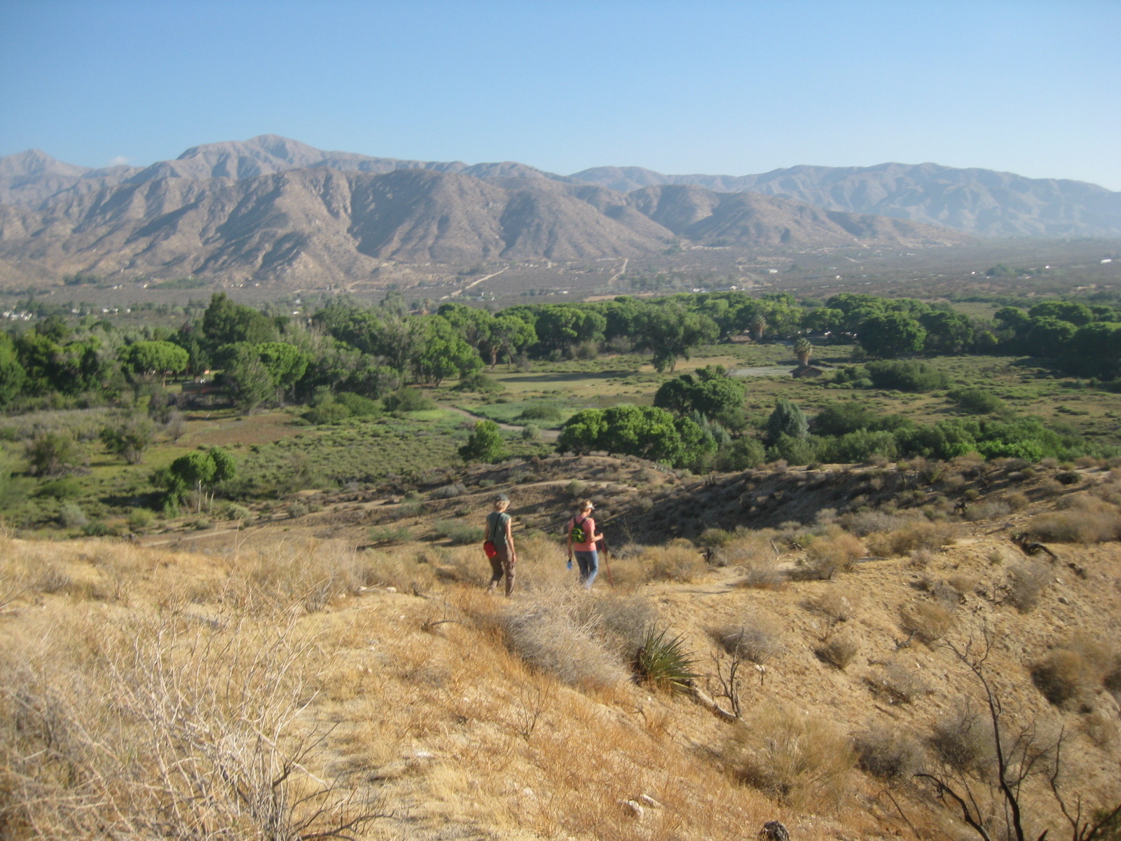 | Hikers winding down the trail into Covington Park, Morongo Valley. |